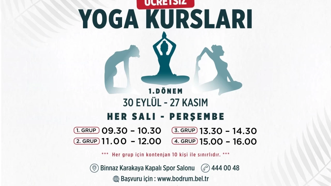 Bodrum Belediyesi Kültür ve Sosyal İşler Müdürlüğü tarafından “Kendinle Buluş, Nefes Al, Güçlen!” sloganıyla hayata geçirilen kursların birinci dönemi 30 Eylül ile 27 Kasım tarihleri arasında düzenlenecek. Salı ve perşembe günleri yapılacak olan kurslar, alanında uzman eğitmenler eşliğinde dört farklı grup halinde gerçekleştirilecek. Her biri 10 kişilik gruplardan oluşan, iki aylık periyotlarla düzenlenen ve her dönem yeni katılımcılara açık olan yoga kursları, ücretsiz olarak verilecek ve kontenjanla sınırlı olacak.