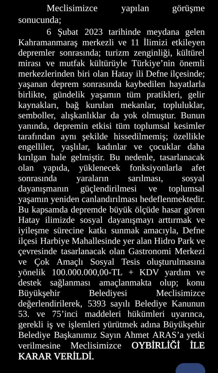Mecliste oybirliğiyle kabul edilen karara göre, Defne ilçesi Harbiye Mahallesi’nde yer alan Hidro Park ve çevresinde Gastronomi Merkezi ile Çok Amaçlı Sosyal Tesis kurulması için 100 milyon TL + KDV tutarında yardım ve destek sağlanacak.